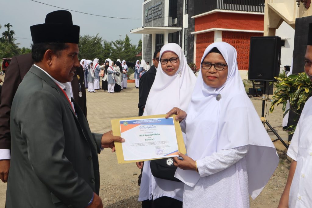 Sertifikat diserahkan langsung oleh Bpk. Sabaruddin,M.Ag (Kasubag TU) dan Bpk. Drs. Abdurrahman Bitai (Pengawas Madrasah). Pada Upacara Peringatan Hari Amal Bakti Kemenag Tahun 2023 di halaman kantor Kemenag Aceh Utara .Sertifikat diterima langsung oleh KAMAD MAS Syamsuddhuha Jumiati,S.Ag